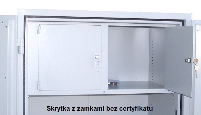 - Skrytka o wysokości segregatora i długości równej szerokości wewnętrznej szafy, skrytka zamykana zamkiem cylindrycznym bez certyfikatu lub zamkiem kluczowym klasy A.
